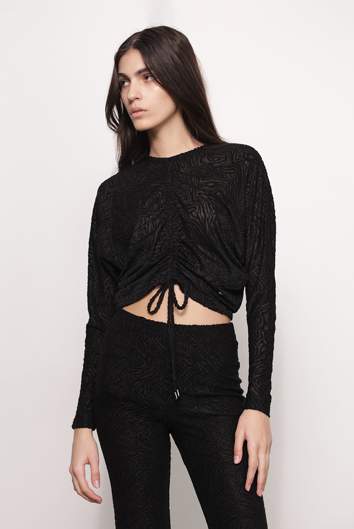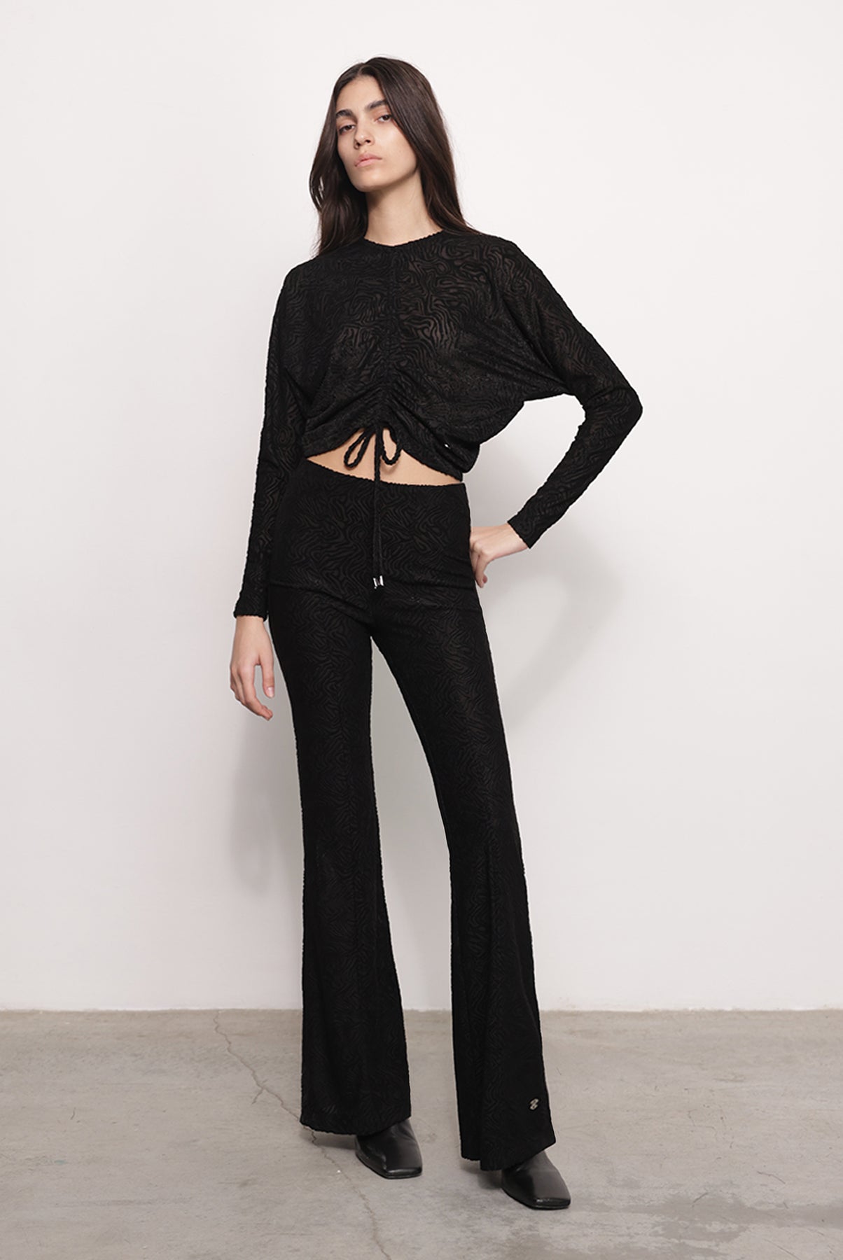 •בד סריג עם צווארון עגול ושרוך משיכה.