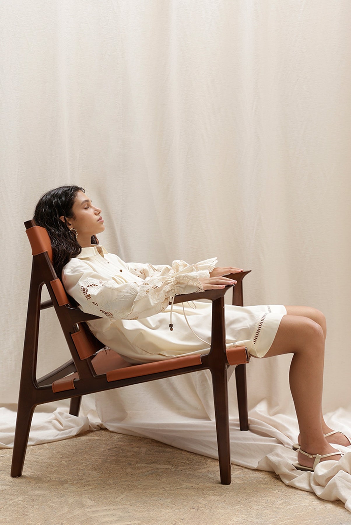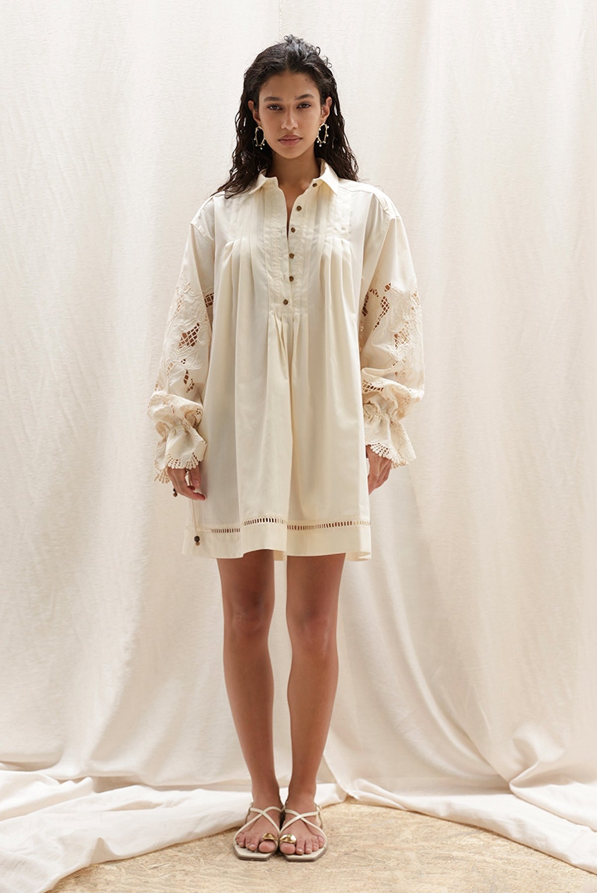 •בד רקום עם צווארון וסגירת כפתורים, בגזרה רחבה ושרוולים ארוכים עם וואלנים.