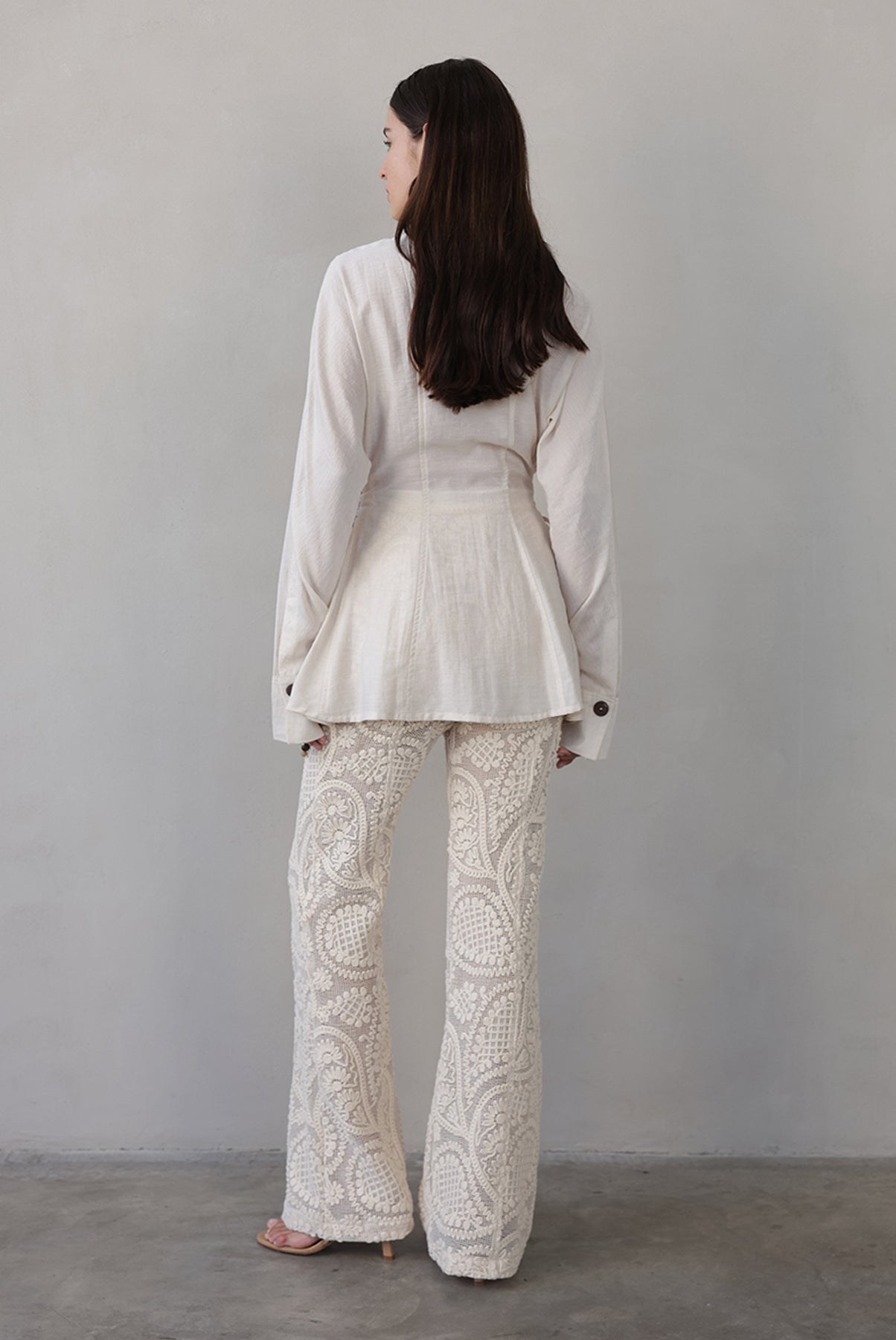 •מכנסיים קז׳ואל מבית סבינה מוסייב. •בד קרושה' עם מותן גבוהה ורגל רחבה. •קיים בצבעים שמנת ירוק מאצ׳ה בהיר ושחור.