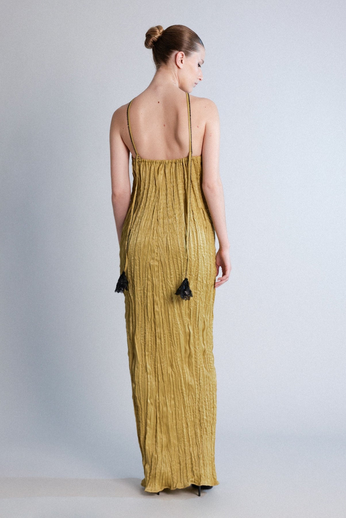 •בד סאטן עם צווארון קולר עם כתפיות ספגטי שנופלות בגב.